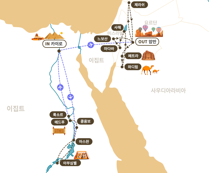 √ 이집트 & 요르단 상품 핵심 포인트 √ 항공 ■ 에미레이트(Emirates) 항공 비즈니스석 탑승 <인천-두바이-카이로/암만-두바이-인천 왕복 탑승>▨ 해당 상품은 아랍에미레이트 항공 비즈니스 단체석으로 진행하오며,지방 내항기 연결 (김해/대구) 불가합니다▨ 비즈니스 단체 보유석 소진 후 추가 예약 고객님이신 경우 실시간 항공으로 예약 시점에 따라서 상품가로 변동될 수 있습니다.▨ 대한항공 마일리지 전환시 적립 가능 (여행종료후 대한항공 홈페이지 개별로 신청 요망)▨ 단체 아랍에미레이트 항공 비즈니스 항공권은 사전 좌석 지정이 불가하며, 발권후 배정되어 있는 좌석은 항공사에서 임의대로 지정한 것이며,항공 좌석 만석등의 경우 일행과 떨어진 좌석을 변경될 수 있음을 양해 부탁드립니다 ▨ 단체 비즈니스 선발권 후 개인 사유로 취소시 취소료 발생 됩니다 ■ 현지 항공 이동 3회 (일반석) ▨ 이집트, 암만 관광 최적의 동선(차량이동 구간 최소화) ▨ 카이로/룩소-아스완/카이로, 카이로-암만 구간 항공 이동 (일반석) ▨ 중간 항공 발권 후 환불 불가한 티켓입니다 √ 호텔 ▨ 월드체인 특급호텔 ▨ 아스완 연박 2박, 사해 1박 여유로운 일정 ▨ 와디럼 럭셔리 캠프 1박 숙박 ※ 5성이라도 같은 5성이 아닙니다. 품격의 차이를 느껴보세요 (Four Seasons Hotel Cairo at First Residence,Fairmont ,Movenpick, Hilton 등 체인 호텔 투숙) √ 핵심 관광지■ 이집트 관광지◐ 이집트의 수도 카이로◑▨ 투탕가멘의 가면 소장되어 있는 『이집트 고고학 박물관 (내부)』 ▨ 이집트 카이로의 새로운 랜드마크 『 그랜드 이집트 뮤지엄 Grand Egyptian Museum(내부)』▨ 피라미드의 수호신 거대한 자연석을 깎아 만든 『스핑크스』▨ 헤롯왕으로부터 아기예수가 피난하였다고 알려진 『성 세르기우스와 바커스의 교회(내부)』▨ 모세가 이집트를 떠나기전 기도를 올렸던 모세기념교회 『벤 에즈라 시나고그(내부)』◐ 거대한 야외 박물관 룩소르◑▨ 투탕카멘 왕의 유적이자 이집트의 여러 왕과 여왕들이 묻혀 있는 『왕들(왕가)의 계곡』▨ 최초의 파라오 하트셉수트 여왕이 건설한 『하트셉수트 여왕 신전(내부)』▨ 람세스 2세에 의해 건설된 이집트 최대의 신전 『카르나크 신전(내부)』▨ 이집트의 고대 신 아몬을 기리기 위하여 아멘호텝 3세가 건설된 『룩소르 신전(내부)』◐ 이집트 최남단의 도시 아스완◑▨ 이집트 제 5대의 여왕 하트셉수트를 위해 만들었으나 균열로 인해 세워지지 못한 『미완성된 오벨리스크』▧ 높이 111M, 제방 길이 3.6KM로 세계 최대의 록필 댐인 『아스완 하이댐, 나세르 호』◐ 위대한 파라오 람세스2세의 걸작 아부심벨◑▧ 이집트 19왕조 람세스 2세에 의해 건립된 『아부심벨 신전(아부심벨 대신전, 하토르 소신전)』 ◐ 고대 신들의 도시 콤 옴보, 에드푸◑▨ 악어 머리의 신 세비크와 매의 머리를 가진 호루스 신을 모신 『콤 옴보 신전(내부)』▨ 매의 머리를 가진 호루스 신을 봉헌하는 『에드푸 신전(내부)』 ■ 요르단 관광지 ◐ 붉은 장미의 전설 속 고대 도시 페트라◑▨ BBC가 선정한 죽기 전에 꼭 가와야 하는 바로 그 여행지!시크길, 알 카즈네 신전, 원형극장, 왕들의 무덤, 나바티안 유적』◐ 아라비아 로렌스의 배경이었던 붉은 사막 와디럼 ◑▨ 영화 <아라비안 로맨스>,<마션><듄> 속 배경으로 유명한 『와디럼 사막의 지프 투어 체험 』▨ 아름다운 별빛속에서의 캠프파이어와 『와디럼 캠프 체험』 ◐ 지구상에서 가장 낮은 곳에 있는 바다 사해(DEAD SEA) ◑▨ 사해에서만 경험 할 수 있는 독특한 『부영 체험(개별진행) 』◐ 모자이크 예술과 관련된 유산으로 유명한 마다바 ◑▨ 비잔틴 시대의 모자이크 지도로 유명한 『성조지성당(내부), 마다바 지도 』◐ 로마 시대의 무역 도시 제라쉬 ◑▨ 『하드리아누스 황제 개선문,제우스 신전 』◐ 요르단의 수도 암만 ◑▨ 암만의 대표적 고대 유적지 『암몬성(헤라클레스 신전, 로마 유적지) 』 √ 식사■ 이집트 대표 식당에서의 전통식 및 현지식 제공■ 이집트 피라미드뷰 레스토랑 특식 ■ 카이로 포시즌 호텔 BBQ 특식 (타사 비교 필수) ■ 필레 신전뷰 레스토랑 특식 ■ 이집트 대표 음식 지중해연안의 해산물요리, 이집트전통 코샤리 풀메다메스, 양갈비 구이 등 √ 기타■ 한진관광 전문 투어 리더 동행■ 가이드/기사 경비 120 USD 상당 금액 포함■ 관광 시 40~45인승 차량 탑승■ 현지 사정에 따라 숙박 도시의 순서 또는 주변의 다른 도시로 변경 될 수 있습니다.■ 일정표에 사용된 이미지는 모두 예시 이미지 입니다.■ 예약 신청금 1인 400만원씩 2일 이내로 입금 시 예약 확정됩니다 .■ 여행잔금은 출발 30일전 까지 진행해주시기 바랍니다■ 가이드의 알찬 설명을 위한 개인용 수신기 제공
