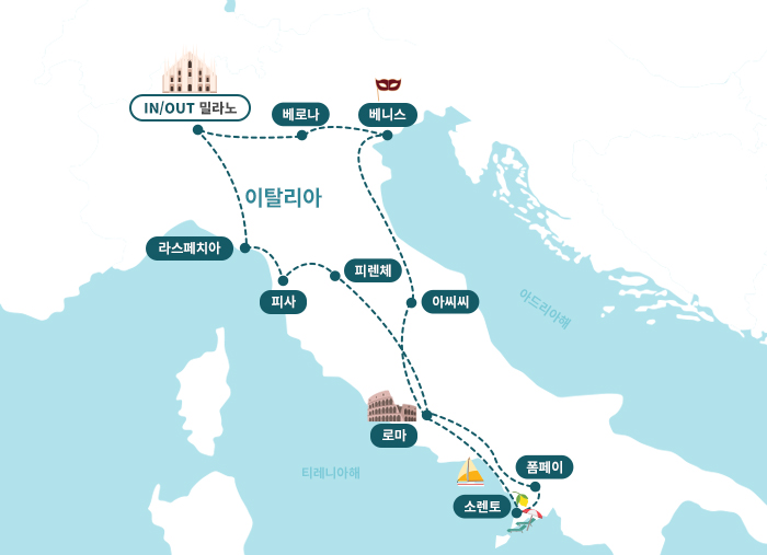 인천-밀라노(1)-라스페치아-피사-몬테카티니(1)-피렌체-로마(2)-폼페이-소렌토-나폴리-로마(1)-아시시-볼로냐(1)-베니스(1)-베로나-밀라노-기내박(1)-인천