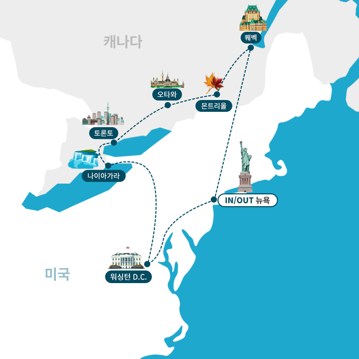 =조식 후 =해리스버그 출발하여 나이아가라로 이동(약 6시간소요) =레인보우 브릿지를 건너 국경통과 후 =나이아가라 폭포 감상 관람지역: 테이블락 포인트, 꽃시계, 월풀, 나이아가라 강변 파크웨이 등 https://www.kaltour.com/fileupload/photogal/Small//S_YTO195.jpg =쇼핑 나이아가라 면세 선물센터 =선택관광 나이아가라 헬기관광 $150/1인 I MAX + 스카이론타워 US$50/1인 중식 업그레이드 $60/1인 =오늘의 특전사항 : 바람의 동굴 포함 =석식 후 호텔체크인 및 휴식 (폭포뷰 숙박) | ||||